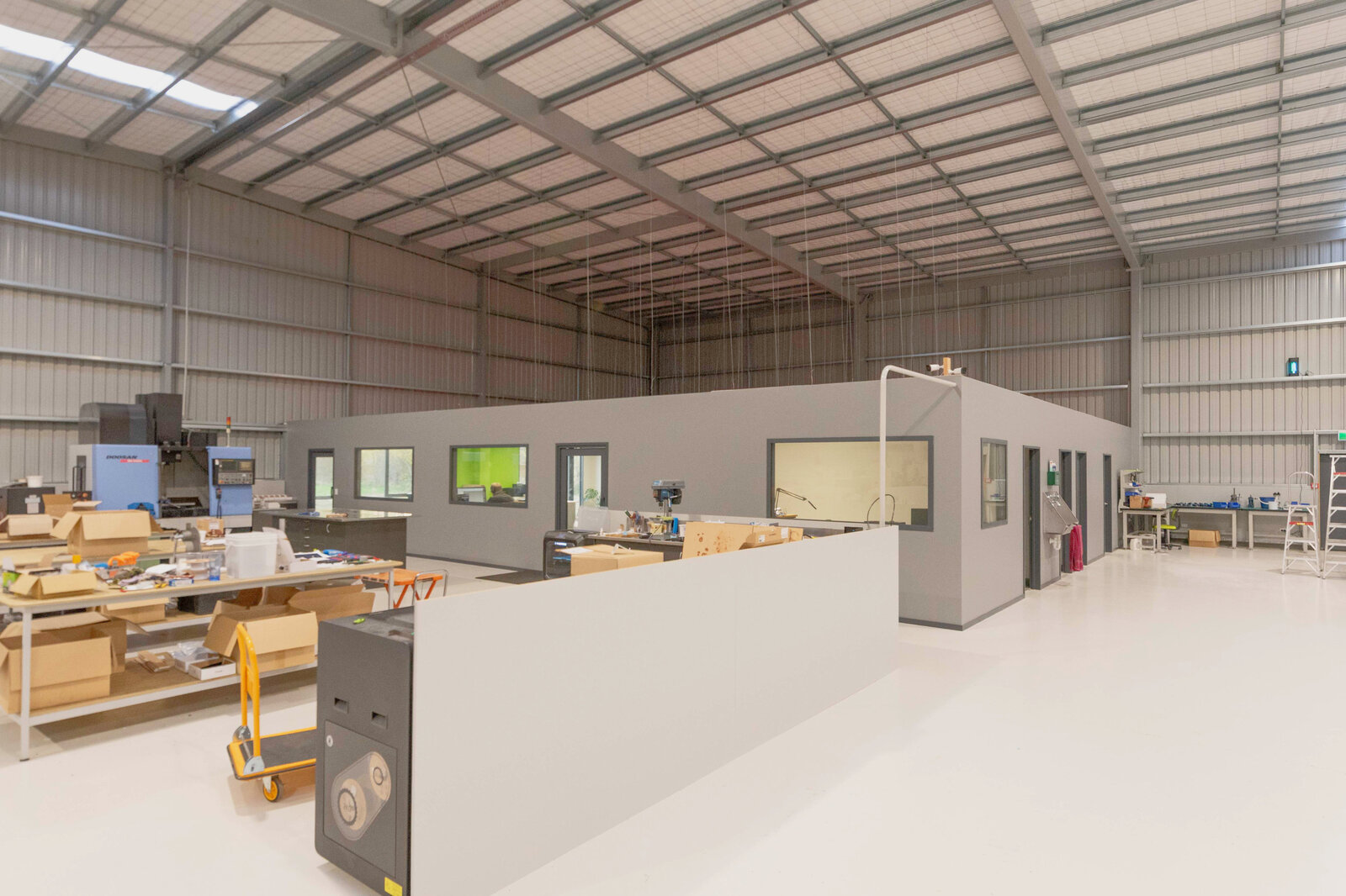 - 185m2 offices and amenities, mostly open plan, with meeting rooms, lunchroom, tiled bathrooms with separate washtub & toilets for the workshop, and an accessible shower